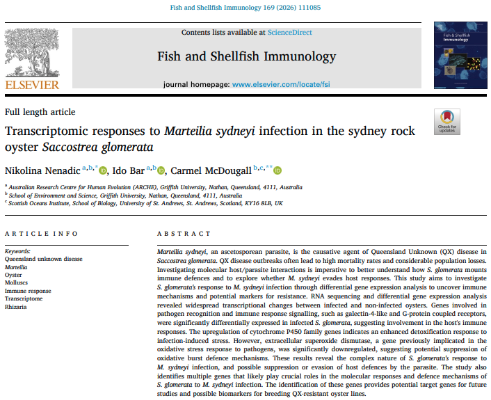 Niki’s paper is now published! Here, she undertakes a transcriptomic approach to investigate the response of the Sydney rock oyster to infection by Martelia sydneyi, the causative agent of QX disease. Results indicate potential suppression of host defences by the parasite. You can read the article here.
